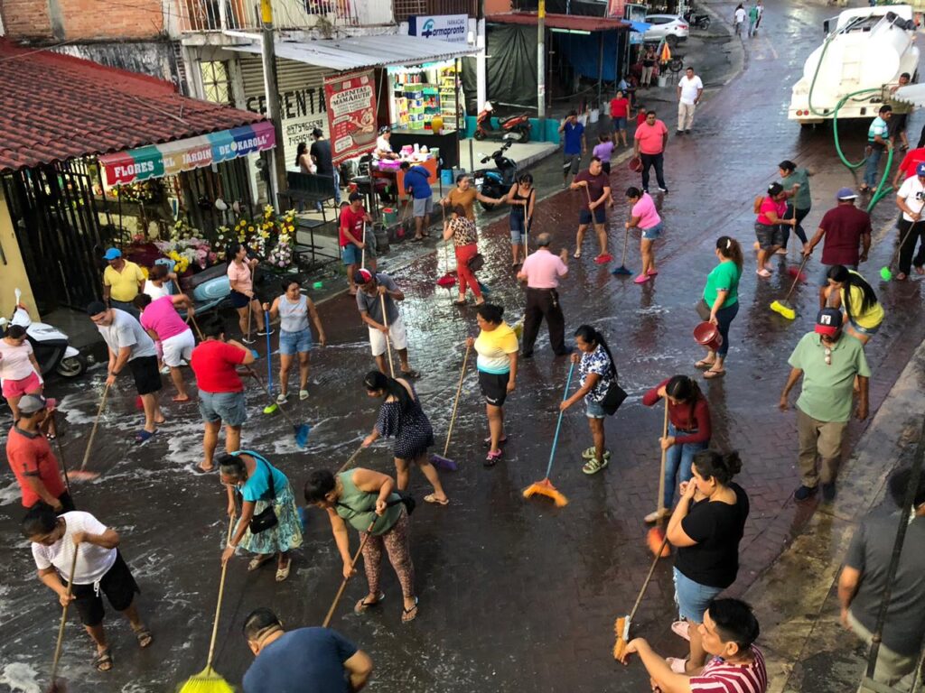 Por instrucciones del Presidente Municipal de Juan R. Escudero, Lic. Oscar Sánchez Luna, directivos, coordinadores y personal administrativo del H. Ayuntamiento realizan labores de lavado y limpieza general en la calle principal de la cabecera municipal, Tierra Colorada.